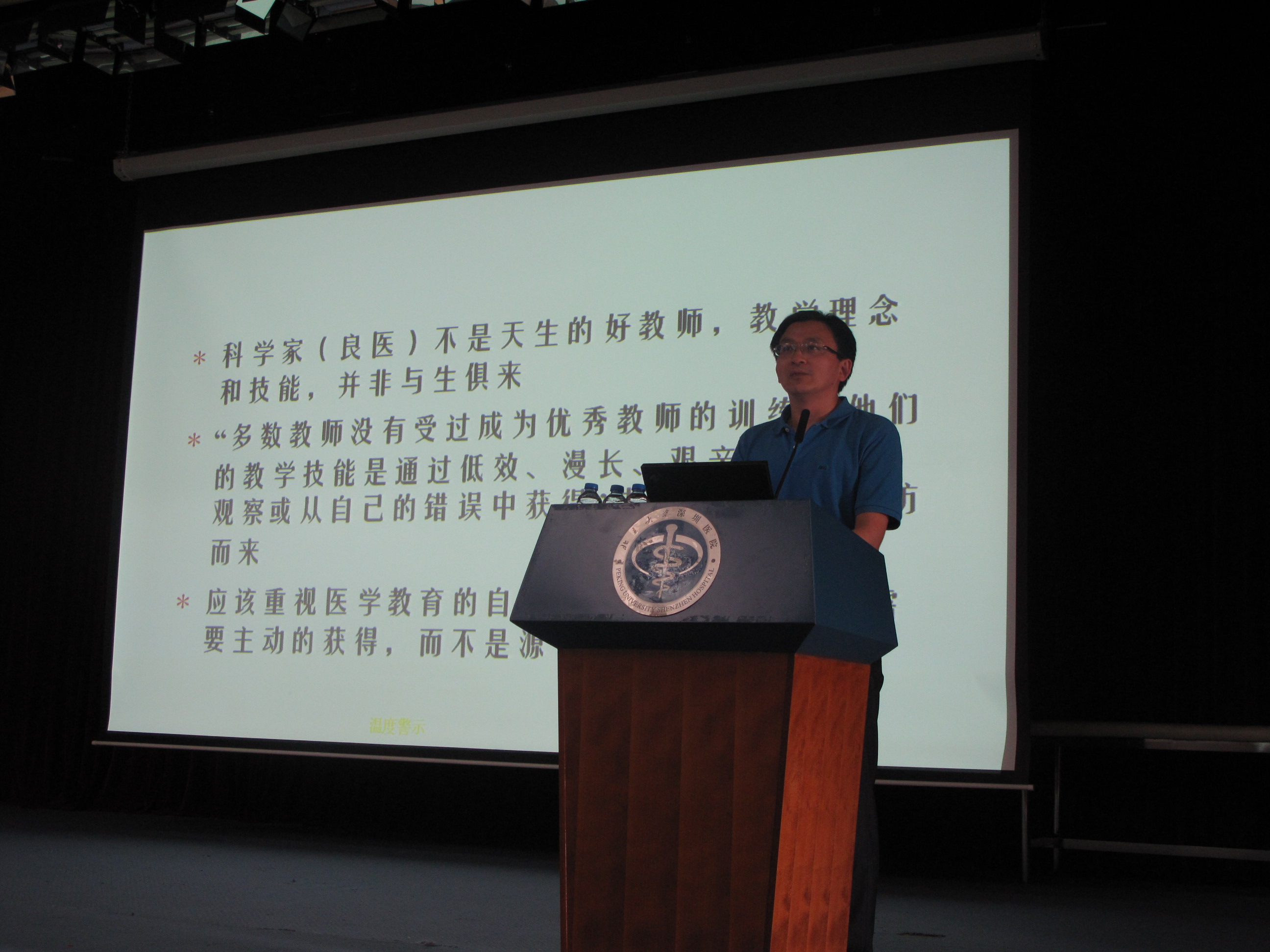紧接着,医学部资深教学专家毛节明教授结合实际阐释了从医师到教师角色的转换,介绍了教师在教学观念、态度及教学法等方面需掌握的知识,并展示了授课者在教学各环节的注意事项及运用技巧。他强调,教师应该以学生为中心,做到“一切为了学生,为了一切学生,为了学生的一切”,只有站在学生角度思考问题,才能了解学生的需求,把课上好,培养出优秀的医务工作者。