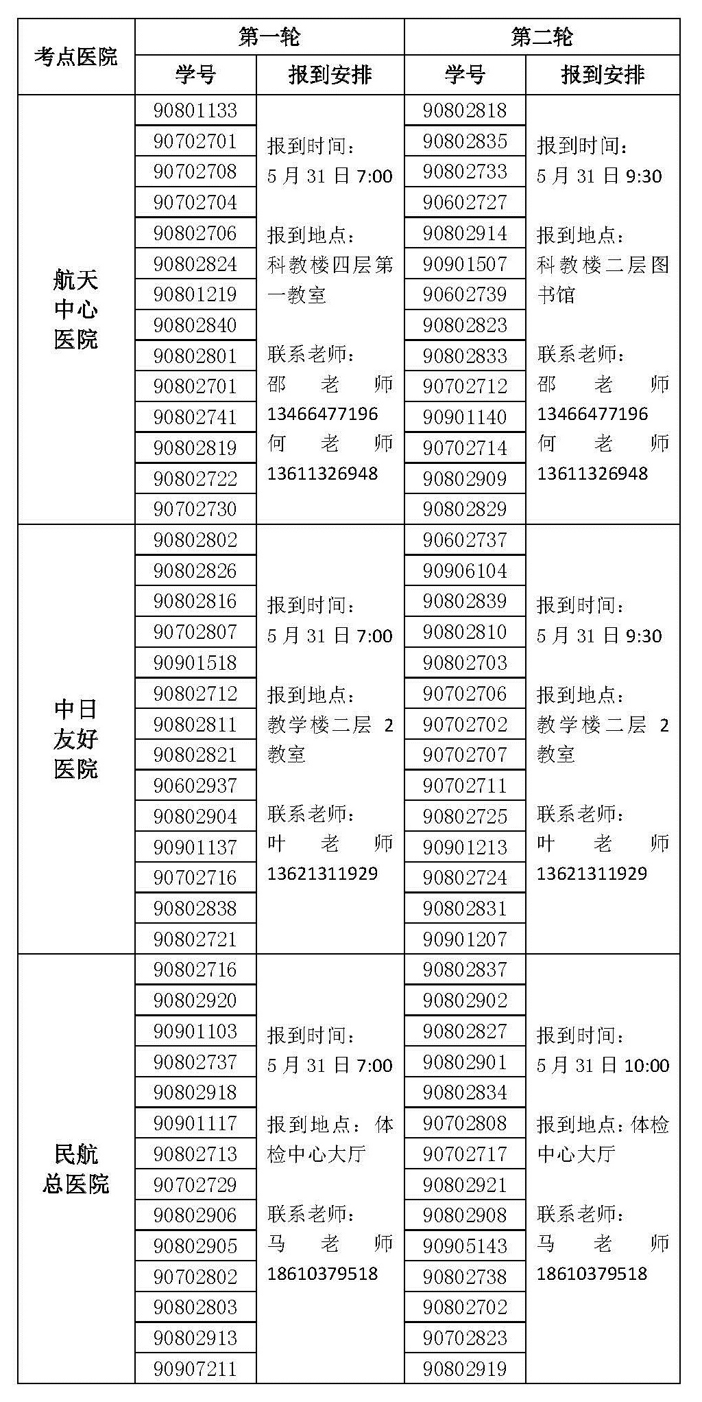 各位考生: 2014届临床医学专业本科毕业考试临床能力考核将于5月31日(周六)在航天中心医院、中日友好医院、民航总医院进行,考生随机分配至三个考点,具体分组情况如下: